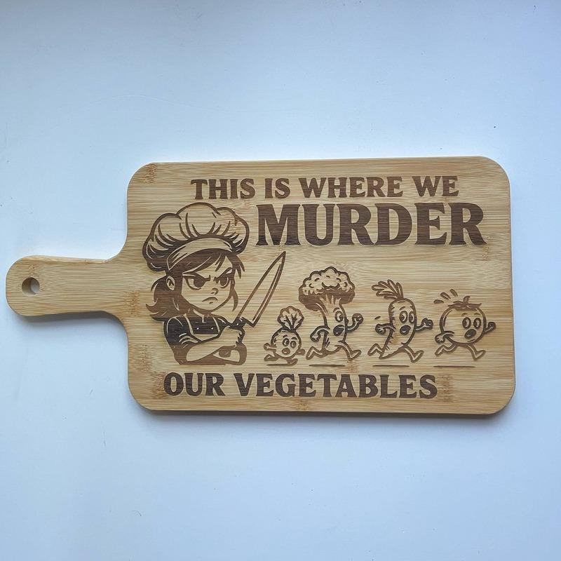 Raise your kitchen game with a solid bamboo chopping board, precision laser engraved and finished smooth for daily use. Choose from two witty designs that look great on display and work hard on the counter.
