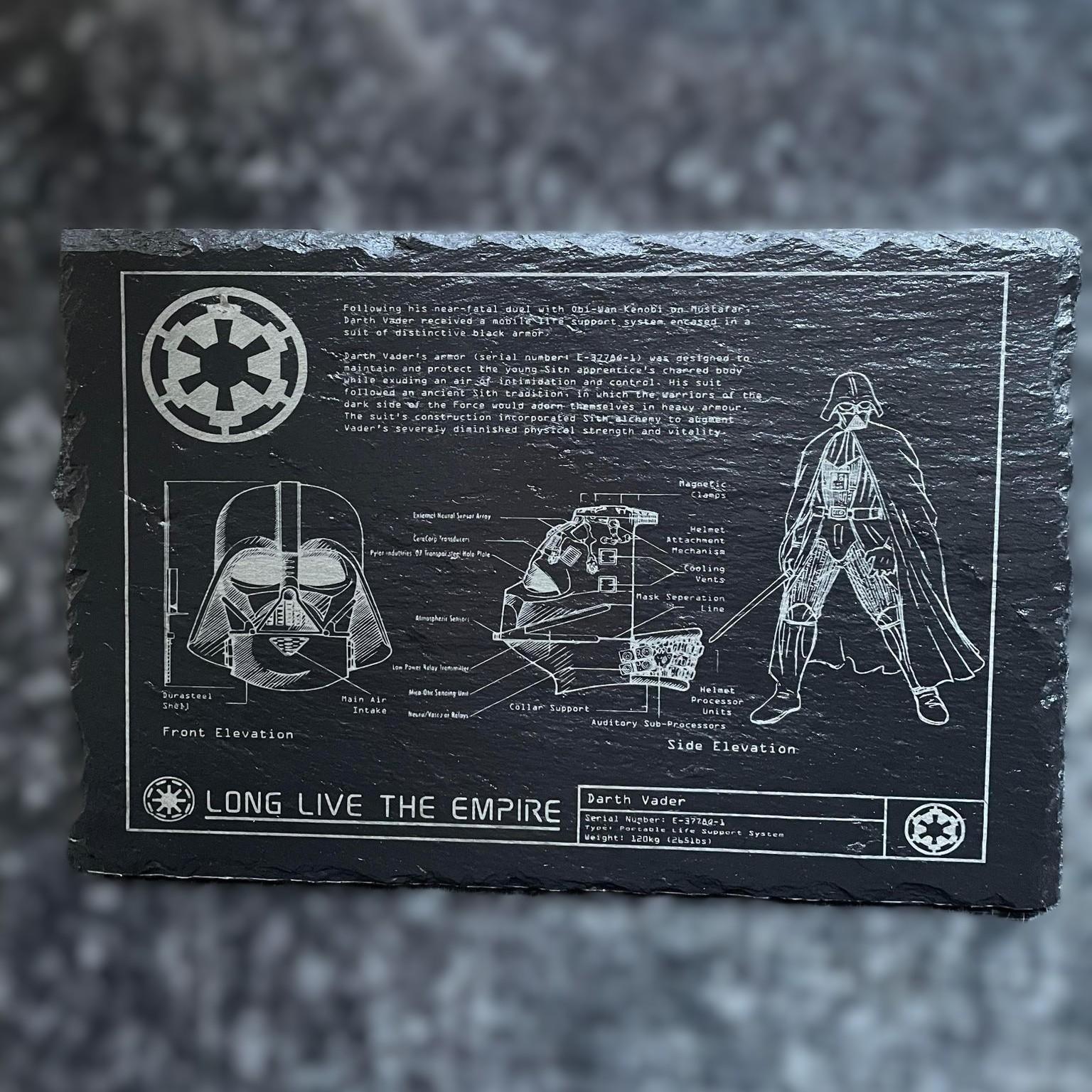 Celebrate the galaxy far, far away with these stunning engraved Star Wars slate plaques. Measuring 29cm x 21cm, each piece showcases detailed blueprint-style artwork of iconic characters and ships, including Darth Vader, Boba Fett, C-3PO, the Millennium Falcon, and Stormtroopers.